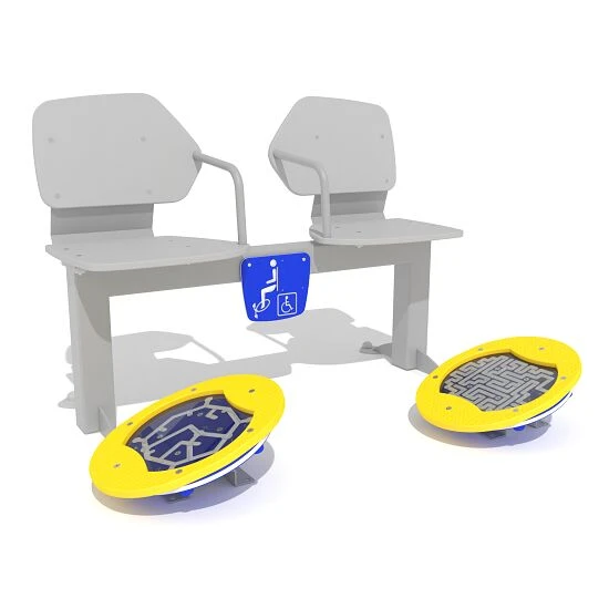 Das Agapito Outdoor-Fitnessgerät „Sitzbank mit Drehscheiben“ verfügt über unterschiedliche Labyrinthe. Diese fördern das Koordinationsvermögen der Beine und Füße. Die Anwender nehmen auf den Sitzen Platz und versuchen anschließend das Labyrinth zu durchlaufen.