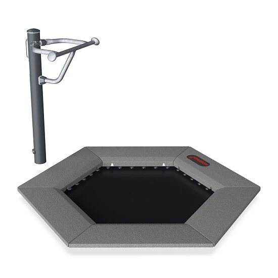 Die Platten aus granuliertem Recyclinggummi (SBR/NR) umranden und schützen somit das Trampolin sowie die Sportler. Im Inneren bietet jede Gummiplatte eine 3 mm dicke, feuerverzinkte Stahlplatte. Der Griff befindet sich 105 cm über dem Boden und 114 cm über der Sprungfläche. Dadurch eignet sich das Outdoor-Fitness-Gerät von Kompan für Frauen sowie Männer.