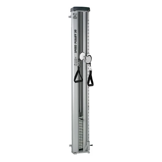 Durch die 5-fache Übersetzung des Lojer Doppelseilzugs „Speed Pulley“ legt das Gewicht nur ein Fünftel des Weges zurück, welches durch die Handgriffe bewegt wird. Und dieses mit einem Fünftel der Geschwindigkeit – bewirkt einen extrem ruhigen Lauf des Gerätes. Ein Springen der Gewichte ist durch die Übersetzung ausgeschlossen! Der mit 2 Handgriffen ausgestattete Doppelseilzug ist zudem ein integraler Teil des multidirektionalen Trainings. Durch Beanspruchung der Mobilität und Stabilität in einer Übung, erreicht der Therapeut funktionelle Bewegungen. Die Übersetzung im Doppelseilzug ist 1:5. In diesem Verhältnis muss auch das Trainingsgewicht berechnet werden.