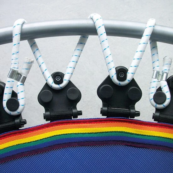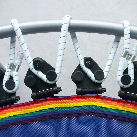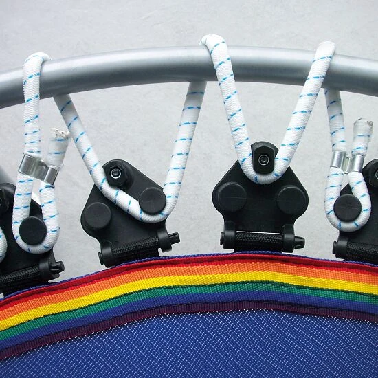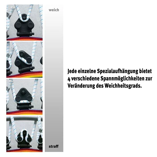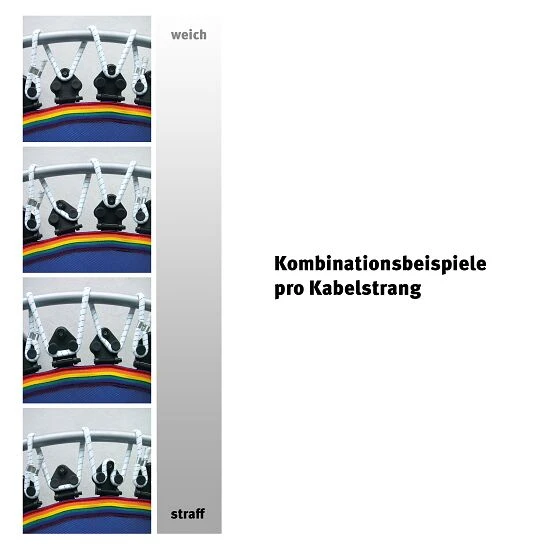 Die Rebounder mit dem Vario-System sind mit Spezialaufhängungen mit 4 Spannmöglichkeiten zur Veränderung des Weichheitsgrades augestattet. Sie können die Kabelführung von 2 nebeneinanderliegenden Aufhängungen beliebig variieren und kombinieren. Dadurch haben Sie 8 verschiedene Variationsmöglichkeiten pro Kabelstrang. Je mehr der 12 Kabelstränge Sie verändern, desto größer ist die Auswirkung auf die Spannung der Sprungmatte. Das Vario-System gibt es beim Trimilin Miniswing, Trimilin Swing und Trimilin Superswing. Sie haben zusätzlich die Wahl zwischen einer Ausführung mit Klappbeinen oder Schraubbeinen. Wenn Sie Ihren Rebounder nur selten abbauen, empfehlen wir Ihnen eine Ausführung mit Schraubbeinen. Wenn Sie über wenig Platz verfügen und das Mini-Trampolin nach jedem Workout abbauen, ist ein Rebounder mit Klappbeinen die optimale Wahl: Klappen Sie nach dem Training die Beine einfach ein und verstauen Sie das Trampolin platzsparend.